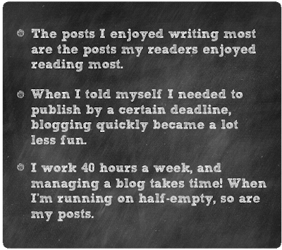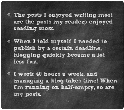 Doing so will give me more time to put together unique, well-thought-out posts I can be proud of on topics I am passionate about, and not holding myself to unrealistic deadlines will make blogging a lot less stressful.